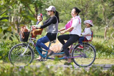周末,市民帶著小孩子在公園里騎行,享受清新好空氣。