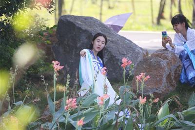 兩名大學(xué)生身著漢服以美人蕉為背景拍照。