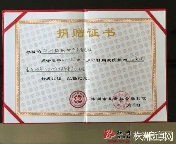 株洲市兒童福利院給蝶依斕頒發(fā)捐贈證書