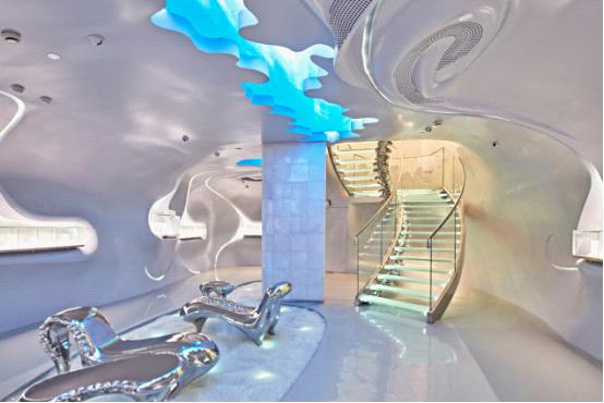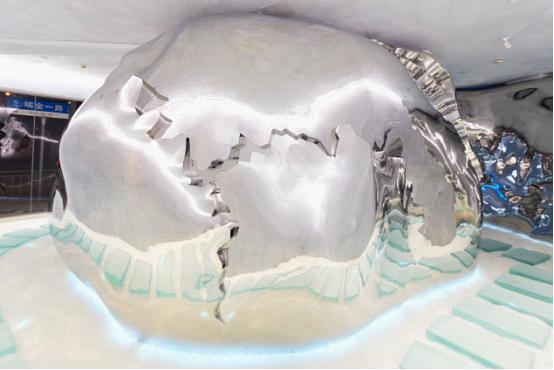 于是,歷經5年構思、2年設計、200多次思維碰撞、700余日晝夜不停的建造,“I Do|洹藝術生活空間”以極其驚艷的方式落座于上海淮海中路758號。整棟建筑以“魔幻天堂”為主題概念,以岡仁波齊神山為靈感來源,締造了一個具有無限想象力與延展力的空間。藝術家在生與死的叩問間不停追尋“愛與永恒”的意義,最終以抽象化的頭顱設計為視覺呈現,使兩層藝術空間形成了被樓板分割成兩部分的巨大液態金屬頭骨,骨縫開合間流淌著仿佛時光流逝般的藍光,將人們帶入了充斥著不可知之力的魔幻天堂。