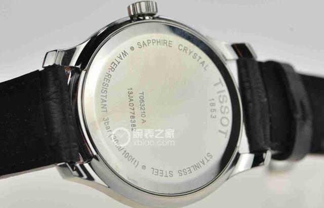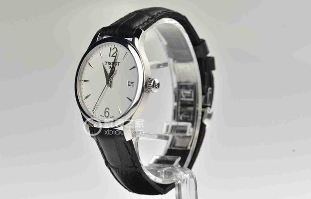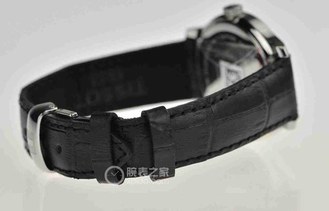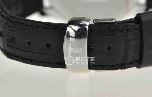 腕表黑色皮帶以折疊式表扣鏈接,不僅開合方便而且不易脫落,安全可靠;表扣上壓印天梭標(biāo)識(shí)“T”,經(jīng)過拋光打磨,圓潤(rùn)有光澤。