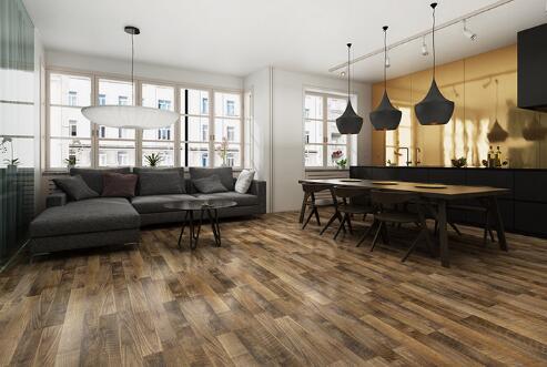 宏耐時(shí)尚地板SS907款,形象演繹霸道總裁FUN,深沉的色澤以及紋理清晰的年輪蘊(yùn)含著無窮內(nèi)涵,恰似歲月沉淀后留下的君子風(fēng)度,鋸齒紋理讓觸感更真實(shí)親切,將其鋪裝在寬闊的客廳里,若再以白色等色彩素凈的家具相配,家居品位瞬間得以提升。