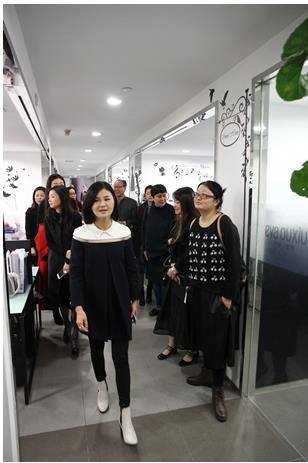 (參觀團(tuán)一行在evaouxiu伊華·歐秀創(chuàng)始人董素芬女士的帶領(lǐng)下參觀EVA時(shí)尚集團(tuán)的辦公室。)
