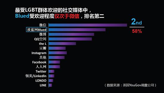 據(jù)英國YouGov第三方機構公布數(shù)據(jù)顯示,Blued受歡迎程度僅次于微信,排名第二;在國內“同志”移動社交App市場,Blued擁有2200萬用戶,其中有1/5用戶每日使用時間超過2小時,占據(jù)其中84.57%市場份額。