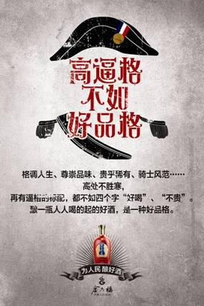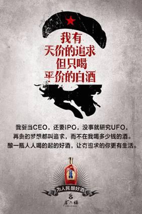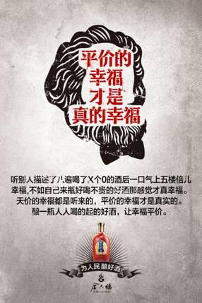據(jù)了解,金六福《民酒宣言》共有6張海報(bào)組成,以“為人民釀好酒”為題,海報(bào)文案處處彰顯關(guān)于“民酒”的吶喊,如“好酒喝得起才是硬道理”、“我有天價(jià)的追求但只喝平價(jià)的白酒”、“平價(jià)的幸福才是真正的幸福”等,同時(shí)又不忘為共和國65周年獻(xiàn)禮祝賀,并在10月1日國慶當(dāng)天官方微信發(fā)布,精彩的創(chuàng)意表現(xiàn),在發(fā)布后即吸引了“4A廣告提案網(wǎng)”、“廣告主雜志”、“酒業(yè)家”等營銷界及白酒行業(yè)權(quán)威媒體的推薦,成功在國慶期間吸引了輿論關(guān)注,引發(fā)廣泛好評(píng)。