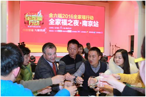 1月24日,南京遭遇25年來“霸王級”寒潮,一場溫暖人心的大型公益活動為南京市民送來了一股暖流。當天,金六福2016“全家福行動”大型公益活動暨全家福之夜?南京站盛大舉行。金六福酒業(yè)董事長李奧,金六福南京大區(qū)營銷總監(jiān)劉芳,以及當?shù)匕儆嗉彝g聚一堂,提前舉杯慶團圓。