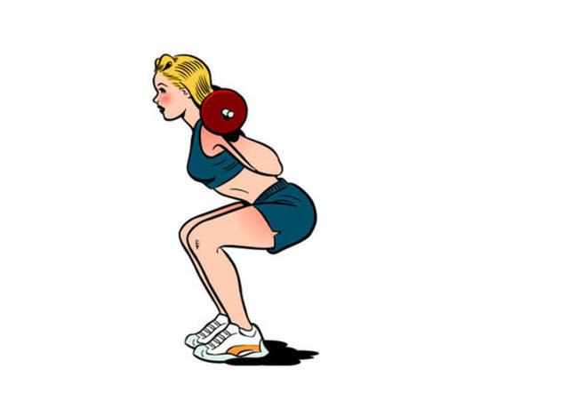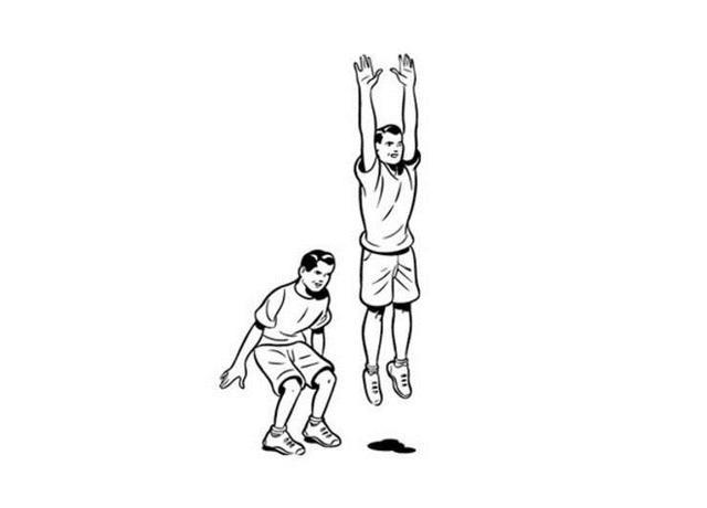 如圖所示,雙腳展開與肩同寬,雙臂垂于身體兩側。然后做下蹲姿勢,直到大腿與地面平行。然后向上跳躍,同時雙臂向上朝天花板方向擺動。落地時膝蓋放緩,慢慢接收緩沖力,同時,雙臂回到初始位置。然后馬上重復剛剛這一套動作再做一次。像這樣來回做10到14組。