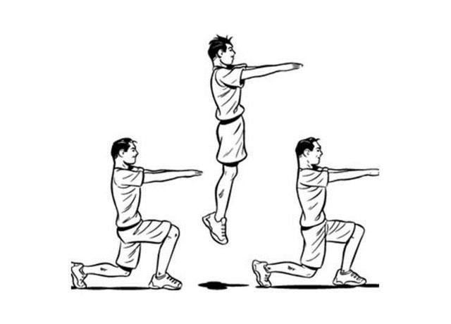右腳向前,腳掌貼地,右膝彎曲,左腳向后跪地,呈弓步狀態(tài)。雙臂向前伸平。然后向上跳。做完后,換另一邊重復剛才的動作,如上圖。