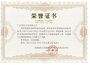 恒潔參與GB/T31436-2015《節(jié)水型衛(wèi)生潔具》國(guó)家標(biāo)準(zhǔn)起草榮譽(yù)證書