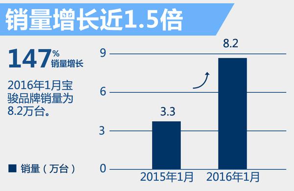2015年1月寶駿品牌旗下730車型還處于銷量上升期,企業(yè)單月整體銷量為3.3萬臺,年中寶駿560正式推出,上市第二月即破單月2萬臺大關,寶駿品牌整體銷量開始迅猛增長。在剛剛過去的2016年1月份,寶駿品牌依然保持了高增長態(tài)勢,1月單月累計銷售新車8.2萬臺,同比增長147%,打響2016年的第一炮。
