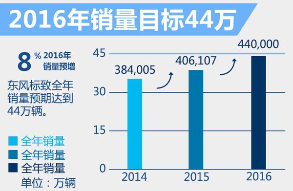 2015年?yáng)|風(fēng)標(biāo)致整車銷量為406,107輛,與2014年的384,005輛相比,增加2.2萬(wàn)輛,增長(zhǎng)幅度達(dá)到了5.76%,增速位列合資品牌第四位。2016年,神龍汽車確立了77萬(wàn)輛的銷量目標(biāo),其中東風(fēng)標(biāo)致品牌的銷量目標(biāo)44萬(wàn)輛。對(duì)比2015年?yáng)|風(fēng)標(biāo)致全年銷量可以看出,2016年?yáng)|風(fēng)標(biāo)致全年銷量預(yù)期增長(zhǎng)8.4%。