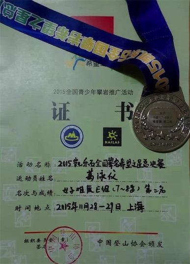 難以置信吧?是的,班級七彩周末的一次活動讓她和攀巖“偶遇”了,站在各專業(yè)團隊的種子選手面前,作為非專業(yè)選手的她也毫不遜色,小小年紀的她并不怯場,以穩(wěn)定的發(fā)揮將銀牌收入囊中。