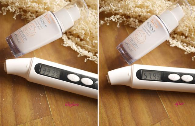 最后來看看涂抹完精華乳的肌膚水分值對(duì)比。 使用前皮膚水分值是33.3%,皮膚感覺偏干摸著粗糙, 而在用過精華乳后水分值上升到57.9%,皮膚摸著柔軟!