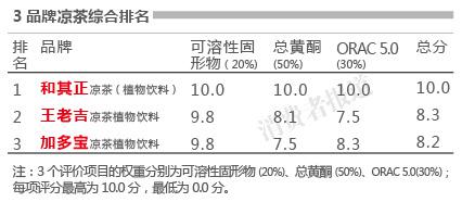 同時,本刊綜合可溶性固形物、總黃酮、ORAC 5.0功效測試三項指標(biāo)對3品牌涼茶進(jìn)行綜合排名的結(jié)果顯示,和其正涼茶綜合評價得分相對較高,王老吉涼茶次之,加多寶則較低。