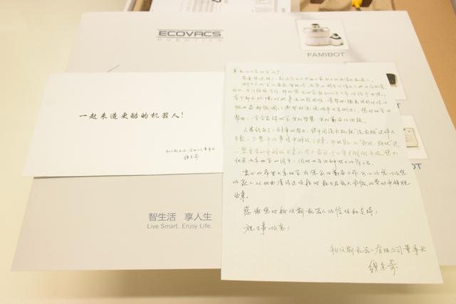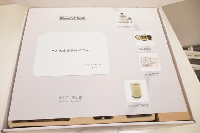 打開盒子,最先看到的是一張印有科沃斯所有產(chǎn)品系列的宣傳單頁,還有一封來自科沃斯的信件,落款則是科沃斯董事長錢東奇先生。信件內(nèi)容則是感謝用戶使用科沃斯產(chǎn)品。