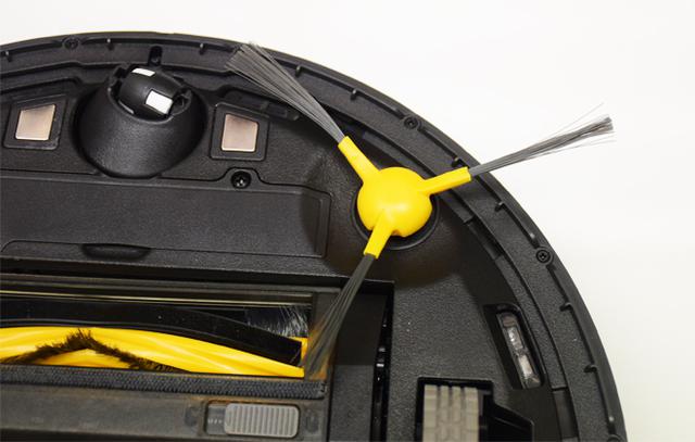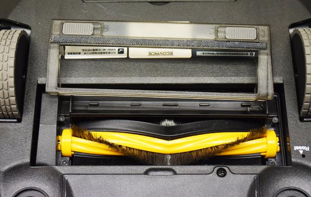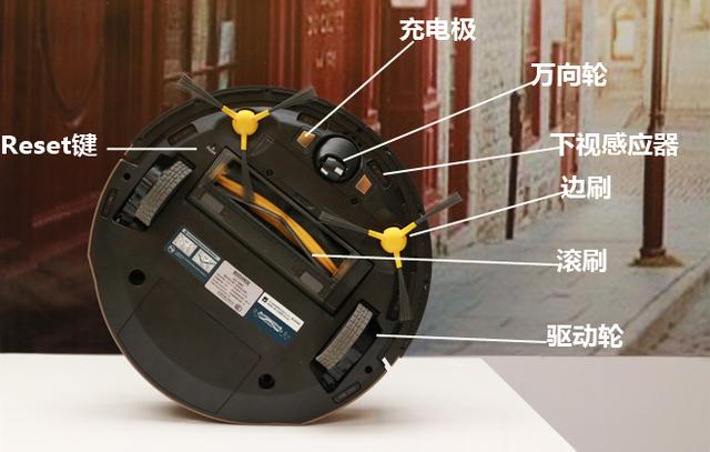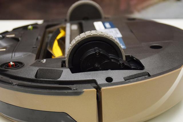 從DR95的底盤結(jié)構(gòu)可以看出,DR95由兩個驅(qū)動輪+一個萬向輪的組合支持行動,清掃則由兩個邊刷和一個滾刷負(fù)責(zé)。萬向輪的兩側(cè)分別設(shè)有一對充電極和下視感應(yīng)器。