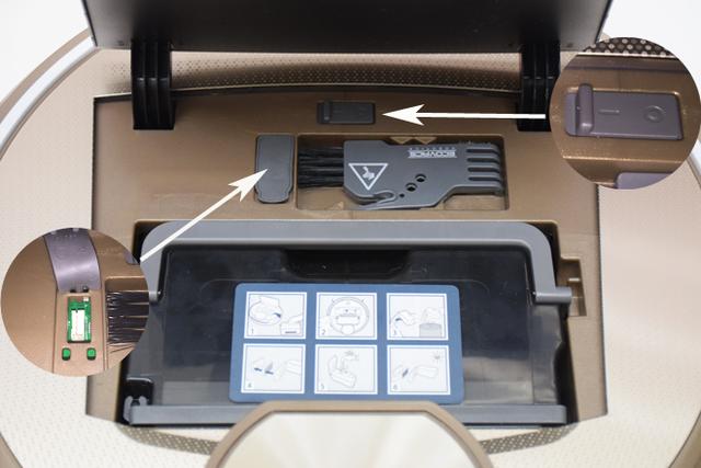 DR95的開關(guān)電源安置在機(jī)身蓋之下,打開機(jī)身蓋即可看見。開關(guān)下方則是一個毛刷,可以用來清潔機(jī)身,毛刷的左邊則是一個四針USB接線口,可以使用隨機(jī)附贈的USB數(shù)據(jù)線連接電腦進(jìn)行系統(tǒng)固件升級。