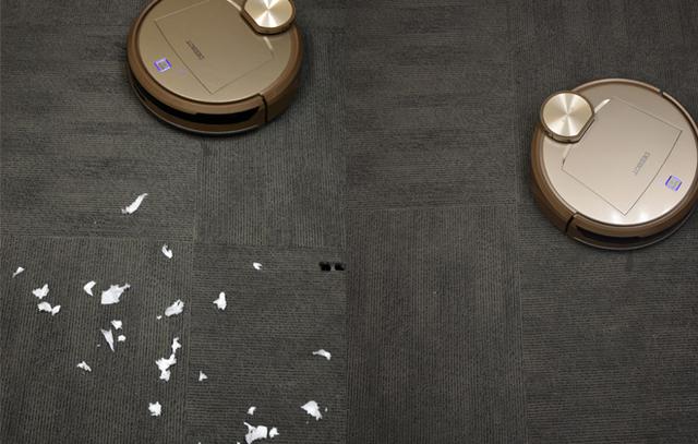 本次實戰(zhàn)測試,筆者并沒有選擇木地板進(jìn)行燕麥或者綠豆清掃實驗,而是選擇在地毯上進(jìn)行碎紙屑清掃。因為靜電的緣故,地毯上紙屑很難清掃,而DR95快速很快就將地毯清理干凈。
