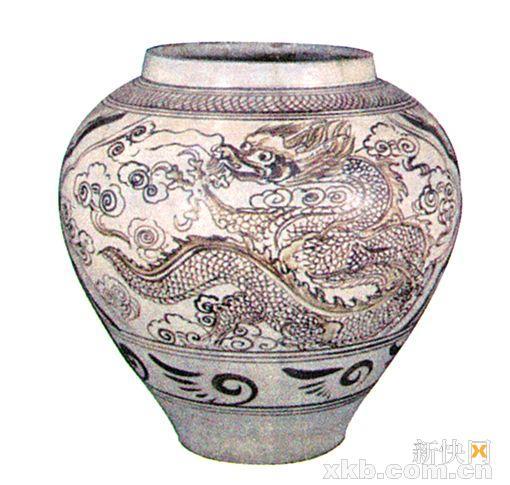 這是一個(gè)元代的磁州窯大罐(左),上面畫(huà)的是龍鳳紋,正面是龍紋,背面是鳳紋。元代的龍還保留了一些宋代的特征,因?yàn)槲幕淖兓^(guò)程往往是緩慢的,是一點(diǎn)一滴逐漸演變的,不是說(shuō)從宋到元龍就變得截然不同了。這個(gè)磁州窯大罐上面所呈現(xiàn)出的龍的特點(diǎn)介于宋元之間。宋代的龍一般來(lái)說(shuō)身體比較強(qiáng)壯、脖子比較粗,但到了元代以后,龍的脖子逐漸變細(xì),尤其是到了元代的晚期。比如,元青花上常見(jiàn)的龍脖子都非常細(xì),是像蛇一樣的細(xì)頸,而且頭很大,比例關(guān)系都完全不一樣了。我們通過(guò)觀察這個(gè)罐子,基本上可以了解從宋到元龍的變化。