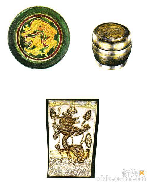 此外,我們還可以看到幾件內(nèi)蒙古地區(qū)出土的文物中龍紋的樣子。遼代三彩刻畫(huà)花龍紋盤(pán),是遼代比較晚期的龍;遼代金花銀奩,是遼代比較早期的龍,跟唐代的龍非常接近;這個(gè)遼代“萬(wàn)歲臺(tái)”金花銀硯盒是遼代的宮廷用硯臺(tái),它是銀的局部鎏金,可以看到那時(shí)候龍的形象。