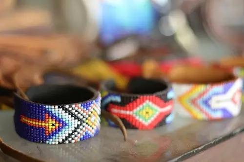 制作皮革手鐲先要選合適的皮革,然后把之前自己所設(shè)計(jì)的圖案跟具民族特色的布縫在一起。我覺(jué)得縫紉是皮革制作中比較困難的地方,因?yàn)槲覀円軐W⒌匕丫、布和皮穿在小孔中。最后,我們制作了兩條手鐲,一條是有民族特色的,另外一條是有蛇臂章與貝殼的皮革手鐲。