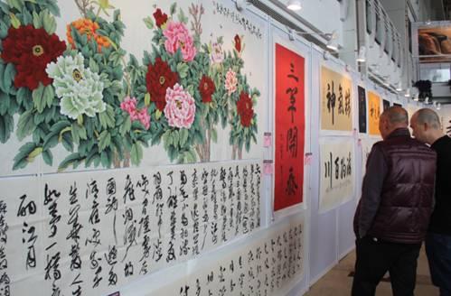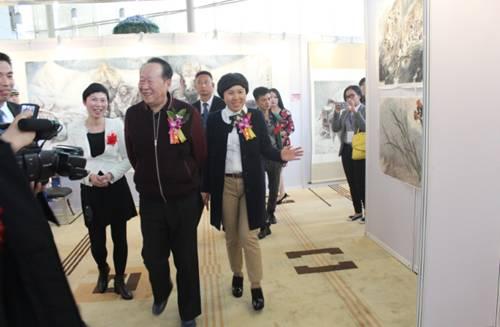 T100品牌創(chuàng)始人董文梅與著名畫家傅又新一同欣賞書畫聯(lián)展作品