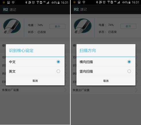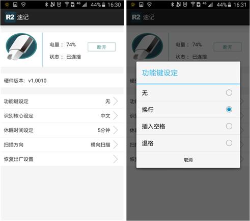 連接后再次點(diǎn)擊該按鈕,我們就能看到速錄筆的連接狀況和設(shè)置。在頁面上我們能夠設(shè)定功能鍵、識別核心、休眠時間、掃描方向,并能夠查看速錄筆的版本信息。在測試中我們發(fā)現(xiàn),功能鍵設(shè)定為回車更為舒適,尤其是對iOS用戶來說,這一設(shè)定彌補(bǔ)了iOS自帶鍵盤無法換行的不足。