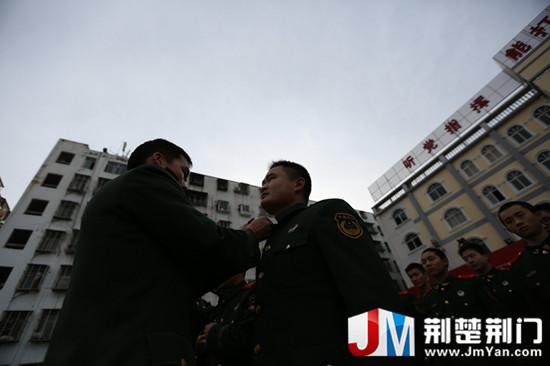 圖為:交接戰(zhàn)斗服,將為國為民的誓言交托到戰(zhàn)友手中
