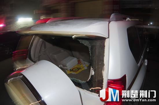 圖為:越野車玻璃被砸價值一萬多元的煙酒被盜