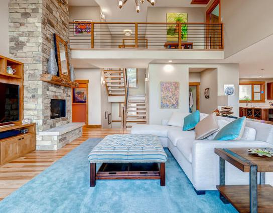 淡藍色的地毯為古樸的別墅帶來一股清新之風,L型的沙發隔斷出客廳與廚房空間,讓大戶型的別墅客廳也擁有溫暖的生活氣息。