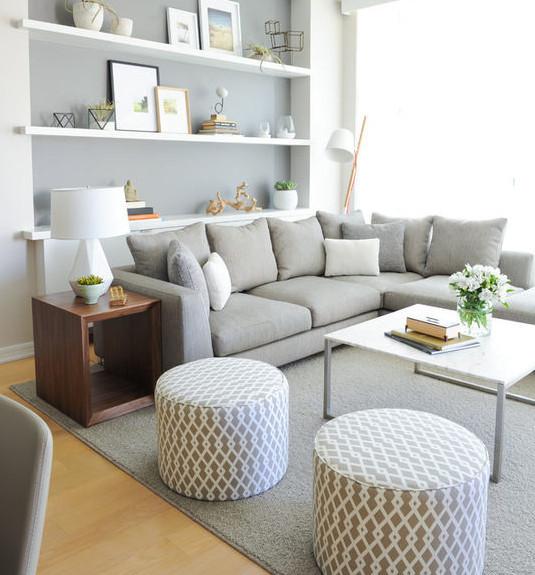 L型的沙發是解救小戶型沙發的利器,透明的玻璃桌幾讓小戶型看起了更為通透,明媚的小插花點亮了空間的明媚之光,簡單利落的家具也可以讓小戶型散發光彩。