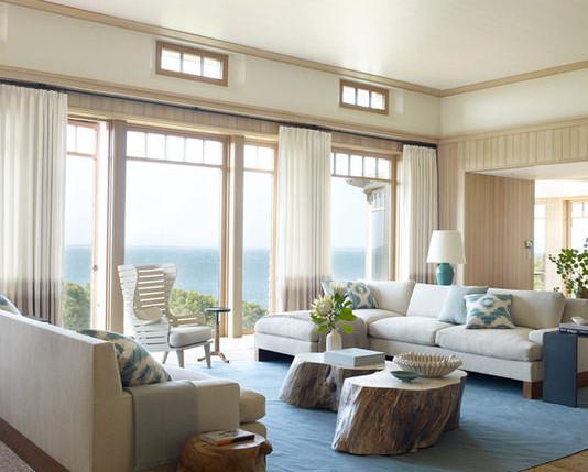 落地窗戶外的磅礴景致,讓室內也有了大氣,粗獷的木質茶幾把戶外的野性自然帶到生活,藍白搭配清新淡雅,舒適自在。