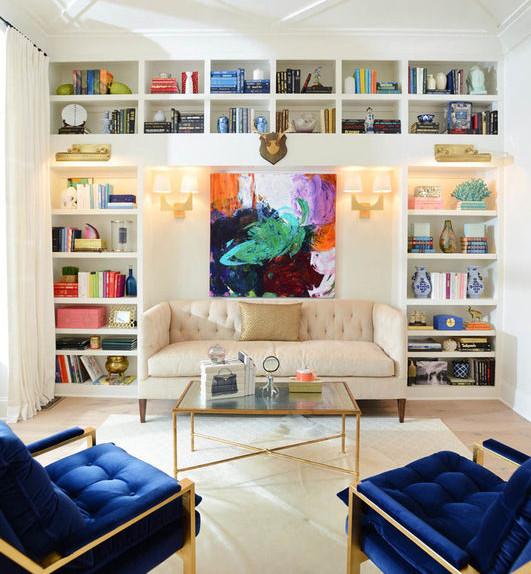 這款小戶型客廳將沙發后的背景墻全都做成收納柜,為小戶型空間開辟出不少實用空間,色彩斑斕的櫥柜飾品和雜物與沙發的明麗一起散發著生活的歡樂活力。