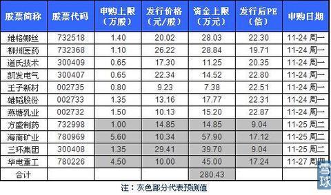 【新股資訊】:本周共11只新股,其中周一申購新股周四回款可循環(huán)申購,本輪全部頂格參與網(wǎng)上申購,最多約需滬市市值56萬元,深市市值15萬元,所需資金約235.43萬元,其中周一發(fā)行7只新股,2只滬市,5只深市,全部頂格參與網(wǎng)上申購,最多約需滬市市值15萬元,深市市值14萬元,所需資金約122.99萬元。