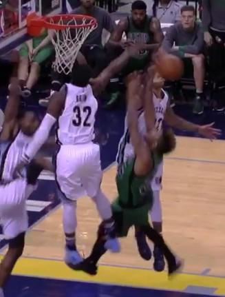比賽的末段,還出現了極其戲劇性,或者可以說是殘暴的畫面。當時凱爾特人的斯瑪特拿球殺入籃下,然后騰空躲閃后,準備上籃得分。