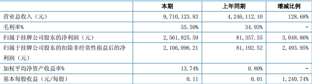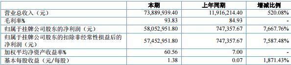 報告期內(nèi),分豆教育實現(xiàn)營業(yè)收入 73,889,939.40 元,較去年同期增長 520.08%。實現(xiàn)歸屬于掛 牌公司股東的凈利潤 58,052,951.80 元,基本每股收益 1.38 元。