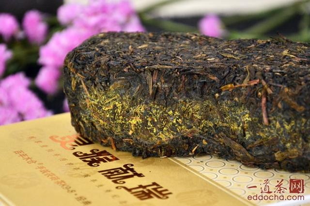 取出茶磚,干茶黑褐尚潤,條索清晰,能看到有嫩梗,適量的梗有利于黑茶的后期轉(zhuǎn)化。茶磚層次分明,壓制得松緊適度,輕輕撬開,就能看到茶磚內(nèi)金花茂盛,均勻飽滿,而且色澤亮麗明艷,十分漂亮。細(xì)嗅干茶會聞到一股隱隱的甜香,讓人更迫不及待地想要沖泡一番。