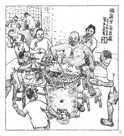 滿庭芳(坊)在今天上海福建中路廣東路這一帶,這個(gè)臭豆腐攤很氣派,賀友直能回憶到的細(xì)節(jié)都在畫里。賀友直說(shuō),“至于攤主的敬業(yè)精神只夠狀其外貌無(wú)能表其內(nèi)心了。總之,我有幾年時(shí)間路過(guò)此地,總是見(jiàn)他一如既往地油炸臭豆腐熱忱周到地應(yīng)付顧客,就此而已。”