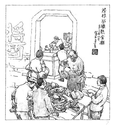 賀友直好酒,年輕時(shí)候一頓飯一斤黃酒不可少。1952年11月,他剛到公私合營(yíng)的新美術(shù)出版社工作,一周要上6天班,平日夜里頭硬性自我克制,因?yàn)橐徽淳凭蜎](méi)時(shí)間畫外稿賺稿費(fèi)了,不能因小失大。但周六周日晚上就可以放開喝酒。這下酒菜,多數(shù)是下班時(shí)路過(guò)看中買下帶回,數(shù)上海大世界西邊對(duì)面的熟食名店“馬泳齋”,光顧得最多。