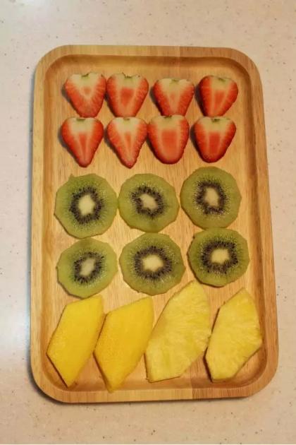 1.把草莓洗凈對切成兩半,奇異果削皮切成與草莓差不多厚度的圓片,菠蘿,芒果切好備用。