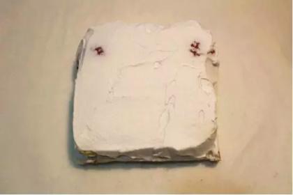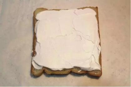 3.取一片吐司上面涂抹一層淡奶油,不要太薄,大概3-4mm左右厚,不要涂抹的太靠邊緣,因為一會邊邊我們要切掉