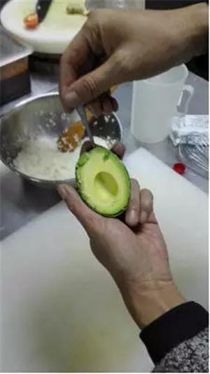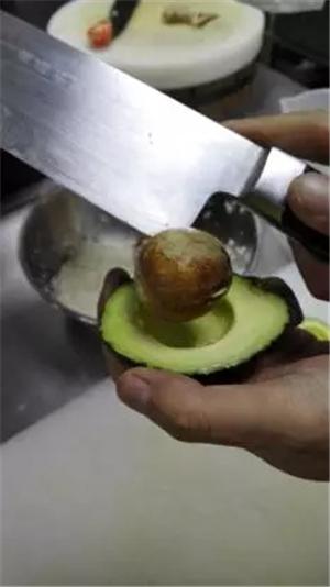 2、牛油果對(duì)半切開(kāi)挖去果核,并用勺子挖出果肉(盡量保證果肉的完整),挖出后切薄片兒備用;