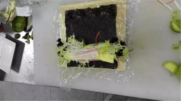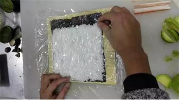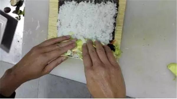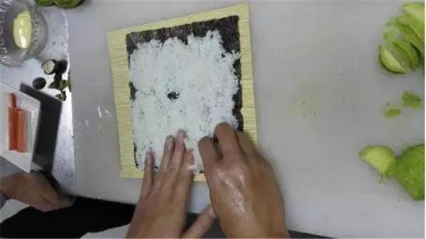 除了上述的反卷壽司的卷法之外,海苔在外米飯?jiān)趦?nèi)的卷法也可以完成適用,即可以將牛油果切絲、切片卷入其中,方法更為簡(jiǎn)單,如下圖: