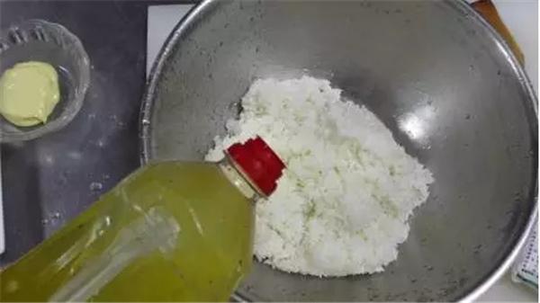 4、在溫?zé)岬拿罪堉校尤胝{(diào)好的壽司醋攪勻至米飯帶有粘度;