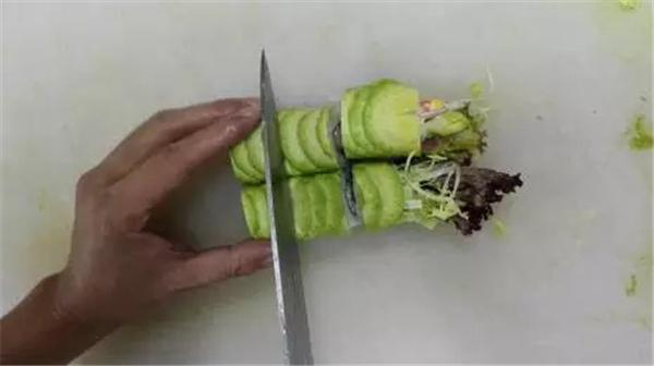 或者你還可以將蔬菜、牛油果等直接卷入海苔片中,也可以,在海苔卷封口處微微沾上一些水即可將蔬菜卷裹得緊實(shí),如下圖:
