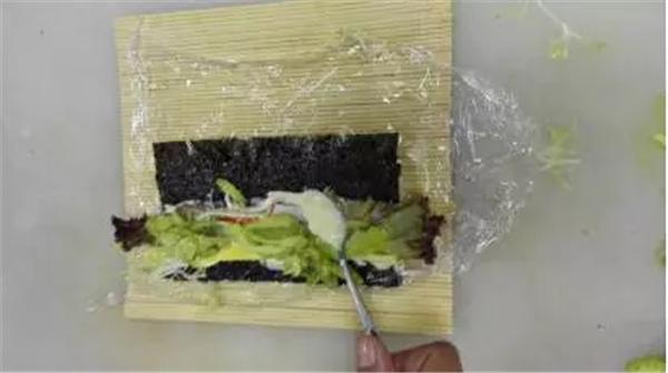 6、將保鮮膜覆蓋在米飯上面,翻面過(guò)來(lái)變保鮮膜為底平鋪在竹簾上,將準(zhǔn)備好的蔬菜絲、蟹棒絲、雞蛋絲碼放在海苔一端,加入一層沙拉醬,用壽司簾卷實(shí),邊卷邊揭開(kāi)保鮮膜(千萬(wàn)不要將保鮮膜卷進(jìn)壽司哦);