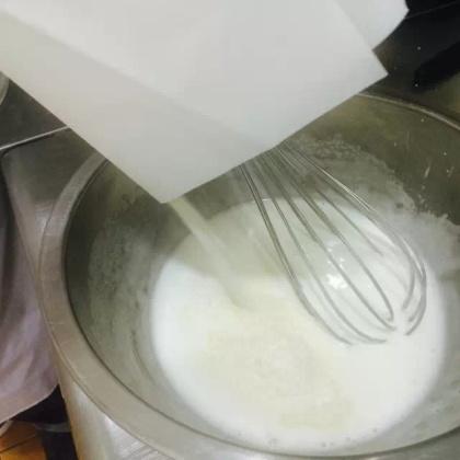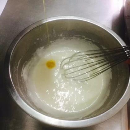 5.等到混合看不到顆粒后,將準備好的黃油加入,小心攪拌,不可用太大的力;