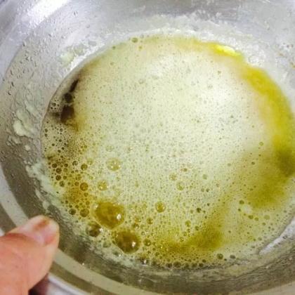 3.黃油加熱到有氣泡,又消失后,變成褐色,立即把加熱鍋放到冰水中,冷卻,目的是為了讓那個黃油保持在最芳香的狀態(tài),不會再變色;預(yù)熱烤箱190度;