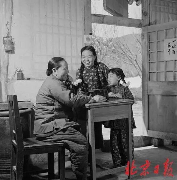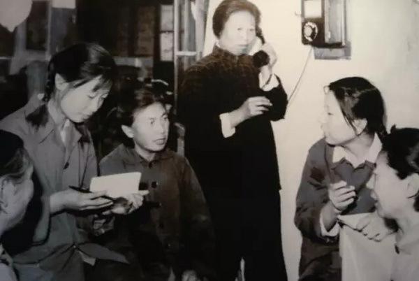 ↑↑1956年,門頭溝大臺(tái)人民公社色林墳大隊(duì)羅道莊生產(chǎn)隊(duì)田大媽給女兒打電話。