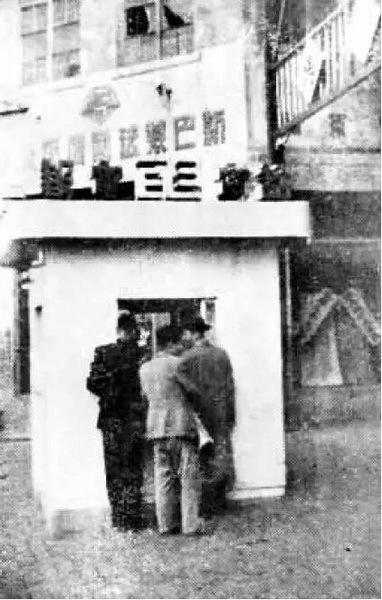 ↑↑圖為設(shè)在東安市場(chǎng)門前的公用電話亭。北京的公用電話亭出現(xiàn)在上世紀(jì)30年代。